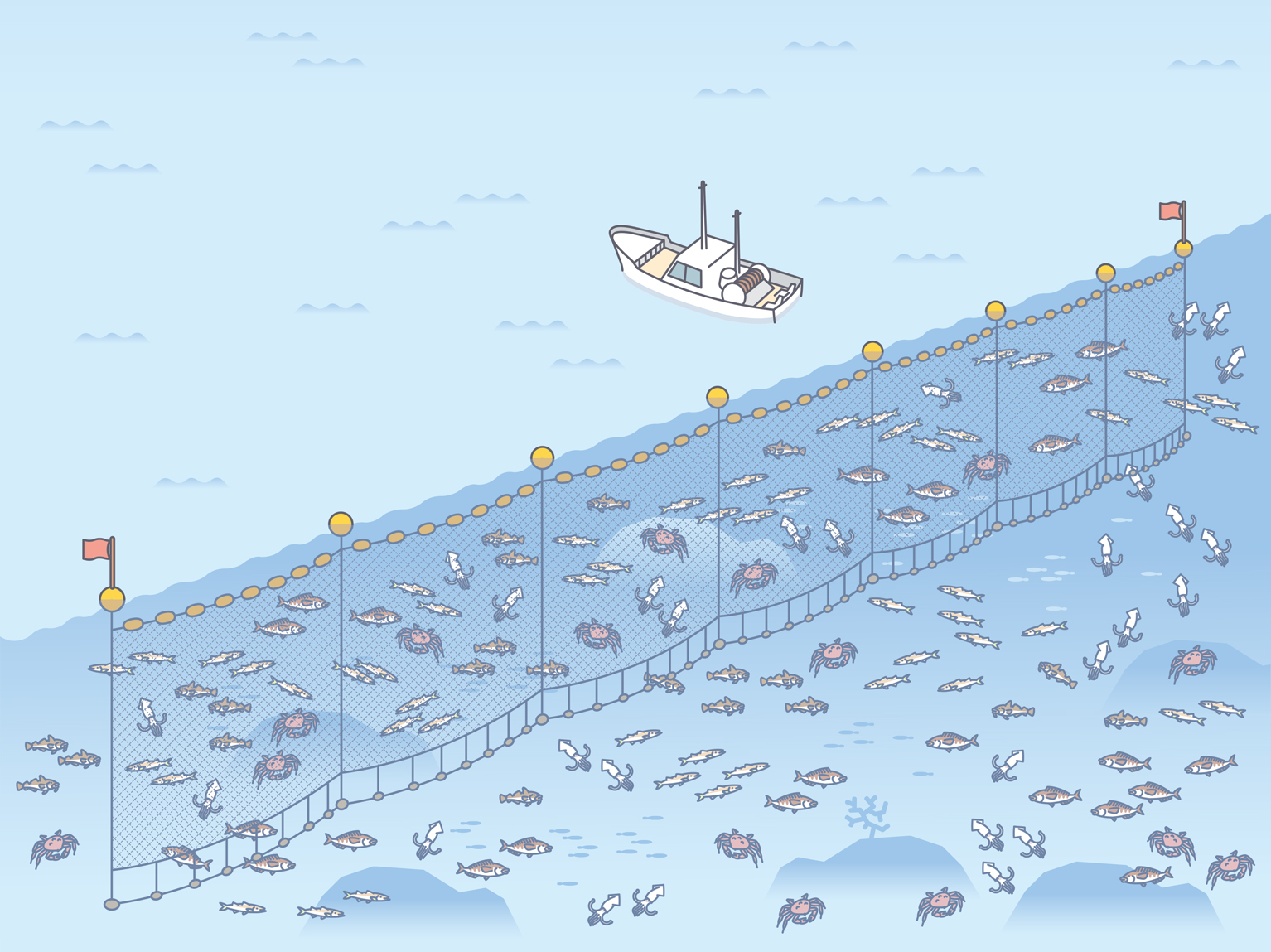 迅速分析に使用する試料は、網の網目に魚を刺したり、からめたりして漁獲する「刺網」という漁法でサンプリングしています。 |