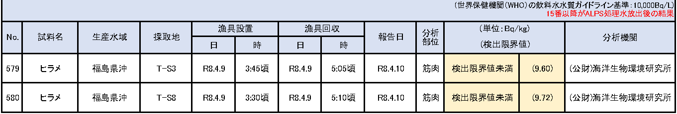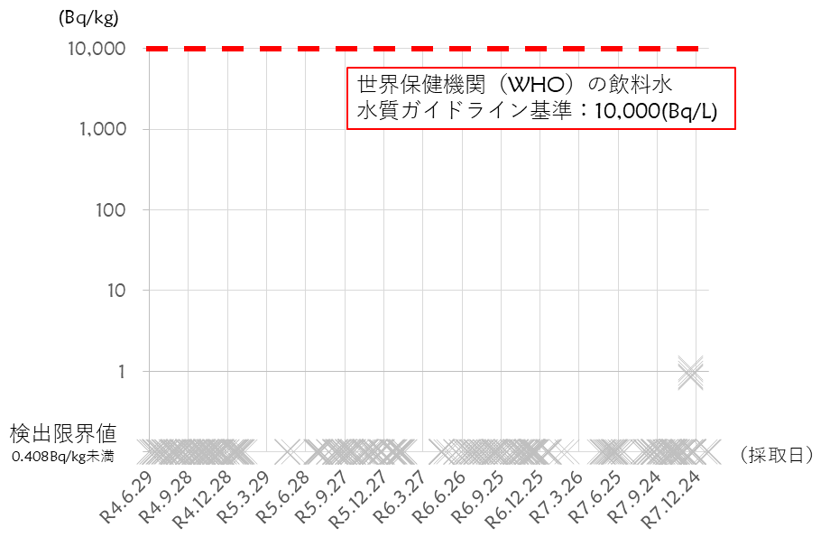 T-S3:緯度 37°27'30"N経度 141°04'44"ET-S8:緯度 37°23'00"N経度 141°04'44"E 世界保健機関(WHO)の飲料水水質ガイドライン基準:10,000Bq/L |