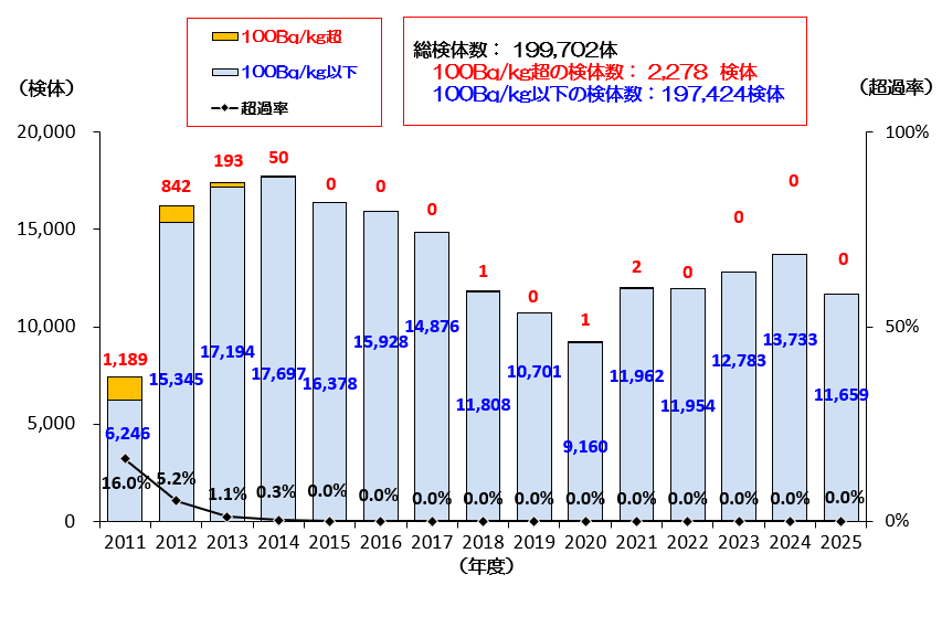調査の結果、基準値(100 Bq/kg)を超える割合は事故からの時間の経過とともに低下する傾向にあります。