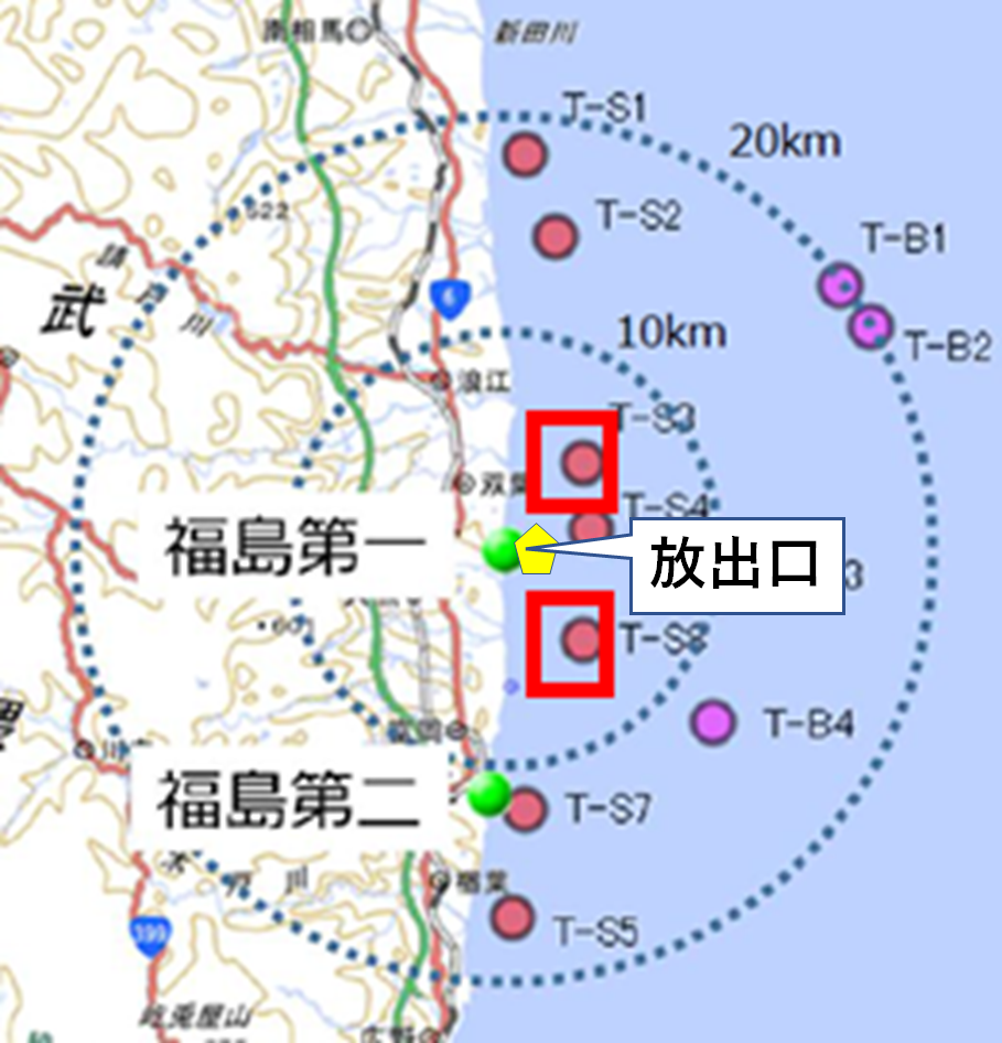 水産庁では、東京電力がサンプリングを実施するT-S3(放出口の北北東へ約4km)、T-S8(放出口の南南東へ約5km)(右図赤囲み)と同位置でサンプリングをしています。