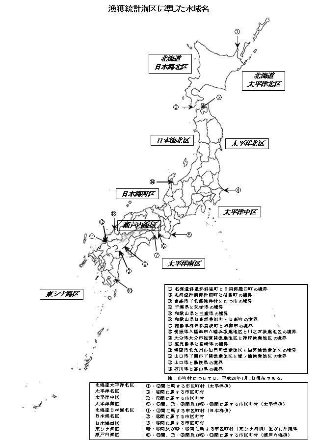 (注)広域な漁場を移動しながら漁獲し、漁獲物を水域ごとに区分せずに一括して船上保管し水揚げを行う場合は、実際の漁獲水域を表す漁獲統計海区よりも広範な水域名を記載することができる。(例:日本海、北日本太平洋等)