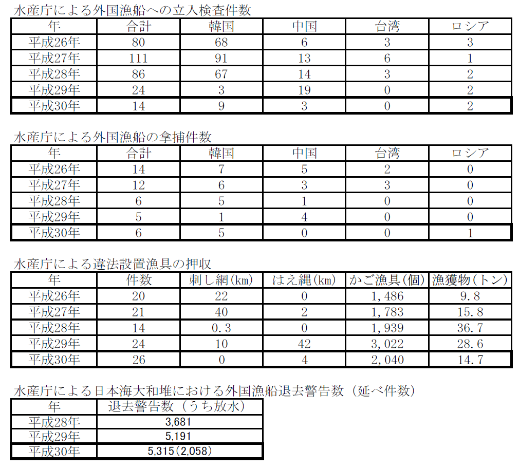 水産庁による平成30年の外国漁船への取締実績は、立入検査14件(前年24件)、拿捕6件(前年5件)、我が国EEZで発見された外国漁船によるものとみられる違法設置漁具の押収件数26件(前年24件)となりました。