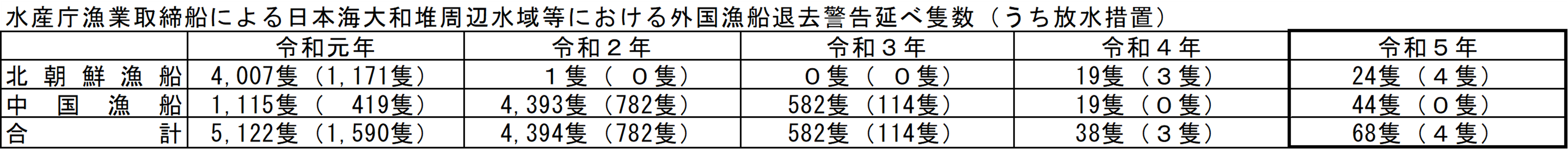 (2)日本海大和堆周辺水域の我が国EEZでの中国漁船及び北朝鮮漁船による操業は、違法であるのみならず、我が国漁船の安全操業の妨げにもなっており、極めて問題となっています。水産庁は、いか釣り漁業の漁期が始まる前の5月から同水域に漁業取締船を重点的に配備するとともに、海上保安庁と連携した対応を行っています。違法操業を行う外国漁船に対しては、放水等の厳しい措置により我が国EEZから退去させています。令和5年の水産庁漁業取締船による退去警告隻数は延べ68隻(前年38隻)で、そのうち延べ4隻(前年3隻)に対して放水を行いました。