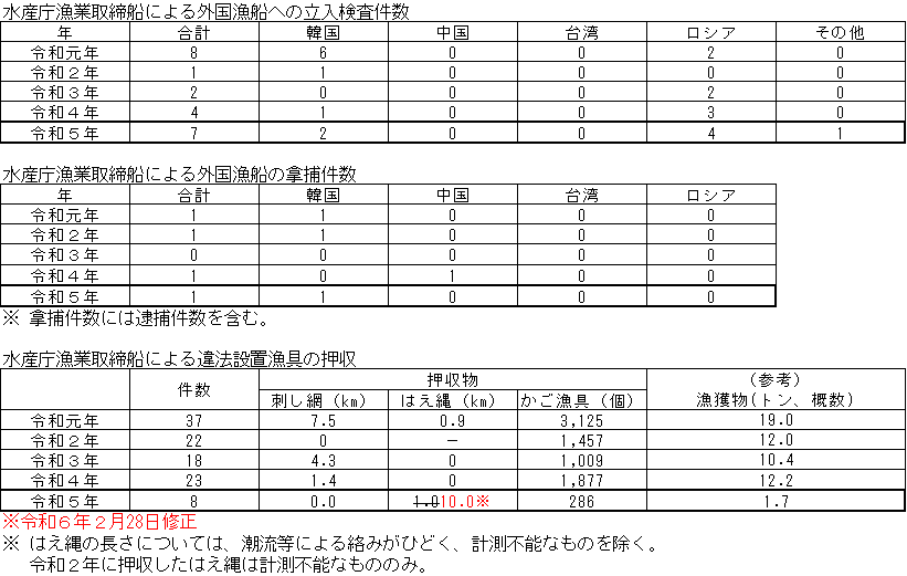令和5年の水産庁漁業取締船による外国漁船への取締実績は、立入検査7件(前年4件)、拿捕1件(前年1件)、我が国EEZで発見された違法設置漁具の押収8件(前年23件)、北太平洋公海における乗船検査16件(前年12件)でした。