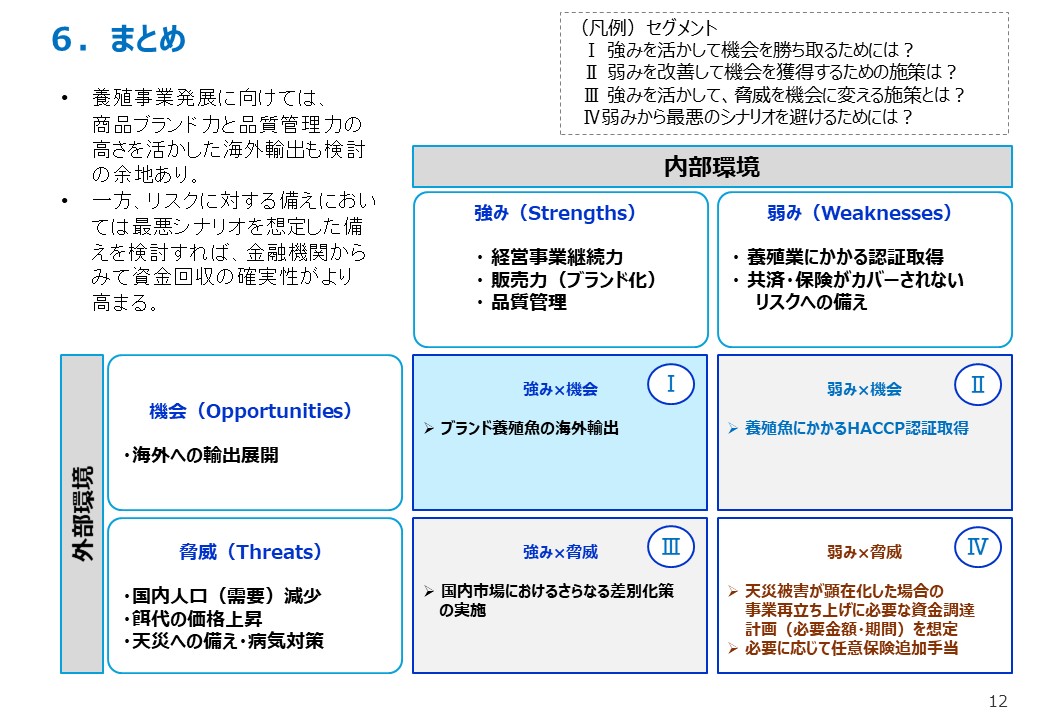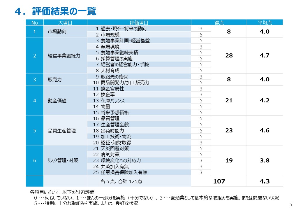 養殖業の事業性評価を「市場動向」、「経営事業継続力」、「販売力」、「動産価値」、「品質生産管理」、「リスク管理・対策」に整理し、評価項目毎に評価する手法を述べています。