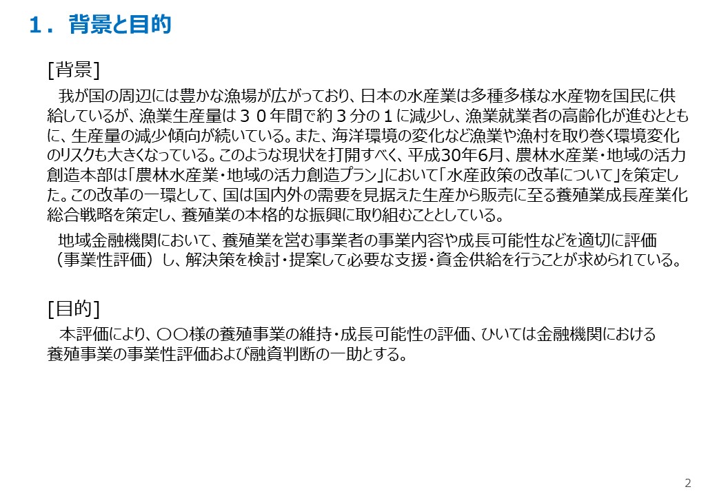 (1)養殖業事業性評価の基本的留意点養殖業の事業性評価をする前提として、経営の特徴、金融事情、食の安全・環境配慮、リスクとその回避策及び養殖業の将来性といった基本的な留意点を述べています。