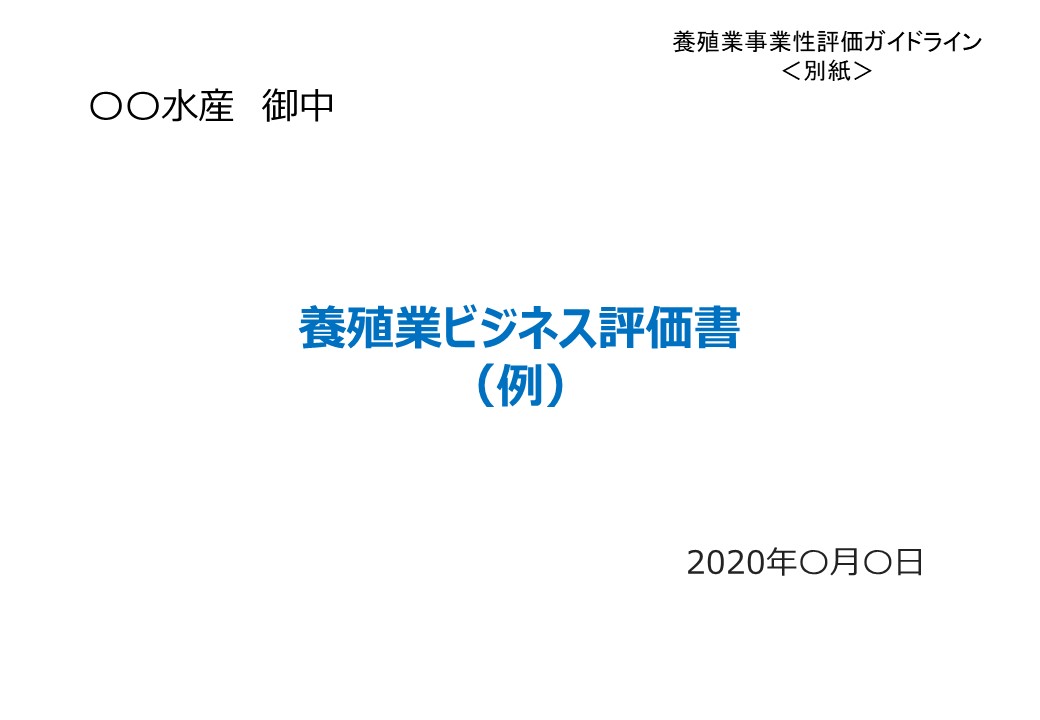 上記(2)の事業性評価の項目と手法に基づき、金融機関が、養殖経営体の事業性を正しく理解するための手段として作成する「養殖業ビジネス評価書」のひな形を提示します。第三者の評価機関や第三者の評価機関を活用した金融機関は、このひな形に評価結果を記載することによって、養殖経営体の事業性を見える化することができ養殖経営体への融資の判断材料として活用できます。また、この評価書により養殖経営体も自身の事業性の理解を深めることができます。