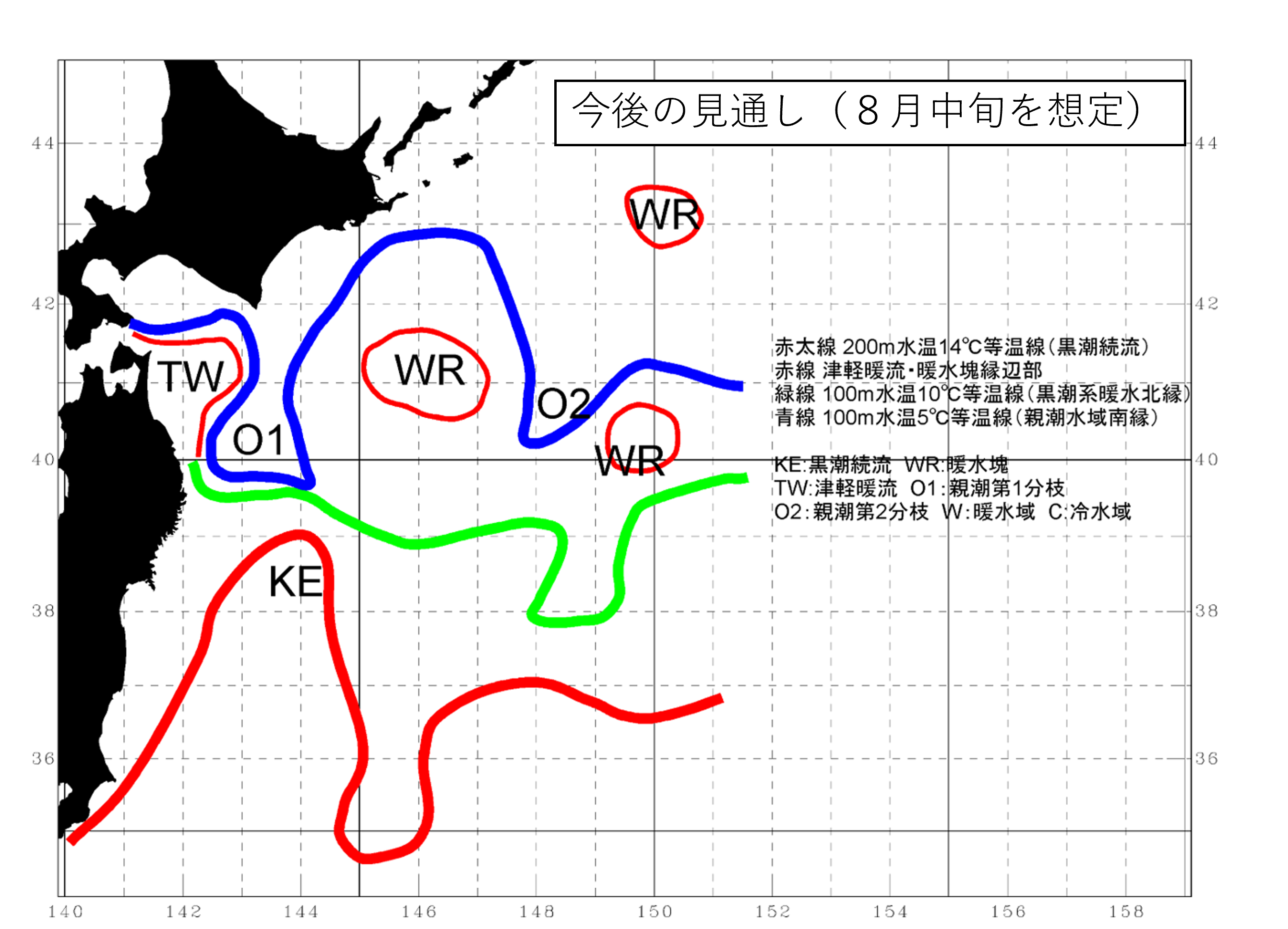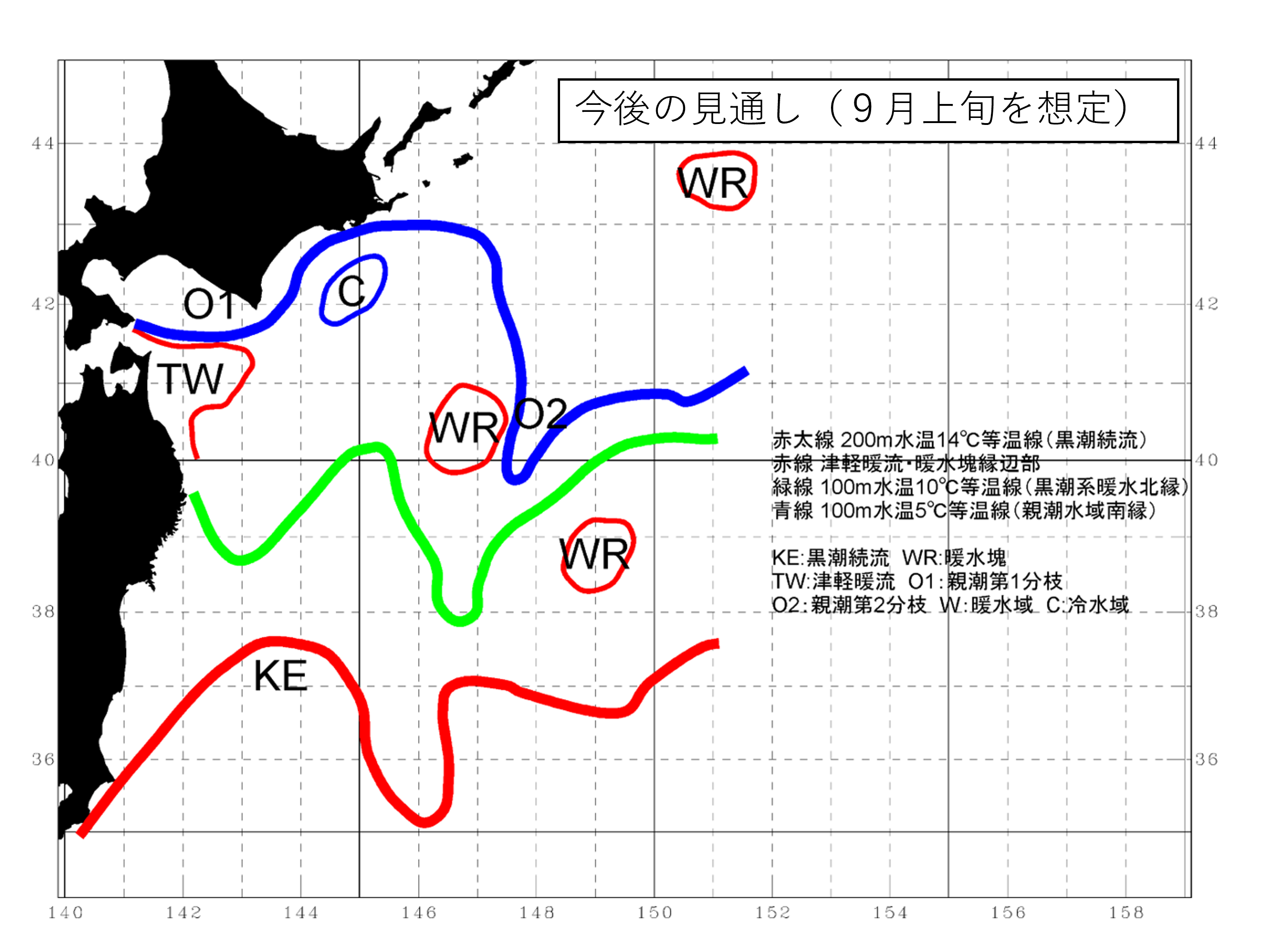 ・三陸沖の暖水塊は北上し、三陸のはるか沖合の暖水塊は停滞する。根室半島沖に暖水塊が形成される。