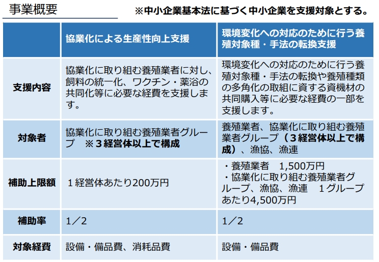 飼料原料価格の高騰や天然種苗の不漁などの新たなリスクの下でも持続的に養殖生産を行うことができるよう、国産飼料原料への転換に対する取組、天然由来の種苗から人工種苗への転換に対する取組、生産コストの低減に資する取組を支援します。事業の内容