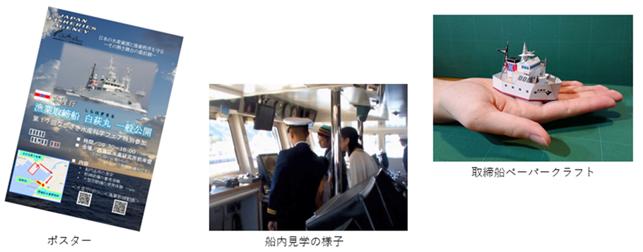九州漁業調整事務所では、漁業取締りに関して広く国民の理解を醸成するため、各種イベントの際に漁業取締船の一般公開を行っております。船内各部の見学や、放水銃や監視カメラなどの漁業取締りで使用する最新装備を見ることができますので、是非足をお運びください。